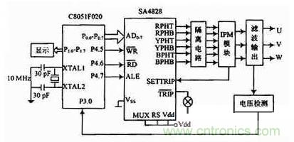 以SA4828與單片機C8051F020為核心構(gòu)成的控制器電路設(shè)計如圖4所示??刂齐娐犯鶕?jù)給定的參數(shù)輸出三相SPWM信號給智能功率模塊IP-M,實現(xiàn)對功率晶體管的通斷控制。C8051F020通過8位P0端口與SA4828的地址、數(shù)據(jù)管腳AD0~AD7相連,工作時,單片機首先對SA4828進行初始化,定義載波頻率,電源頻率范圍、死區(qū)、最小脈沖取消時間等參數(shù)。然后向SA4828的控制寄存器傳送電源的頻率控制字和幅度控制字等參數(shù)。正常工作時,根據(jù)需要對SA4828的控制數(shù)據(jù)進行修改,實現(xiàn)系統(tǒng)的反饋與實時控制,以及調(diào)壓控制。為實現(xiàn)系統(tǒng)的穩(wěn)壓功能,采用平均值反饋PI調(diào)節(jié)。輸出電壓經(jīng)隔離送入C8051F020單片機的A/D轉(zhuǎn)換口即P3.0口,轉(zhuǎn)換結(jié)果參與PI運算,運算結(jié)果即為SA4828幅度控制寄存器的控制字。從RPHT~BPHB的6個引腳輸出相應(yīng)頻率和電壓的SPWM控制信號,經(jīng)隔離電路后,分別控制智能功率模塊IPM的6個IGBT的導(dǎo)通與截止,最后在3個輸出端上產(chǎn)生對稱的三相SPWM電壓。SA4828作為單片機的外設(shè),與單片機并聯(lián),通過對單片機編程,只需將SPWM的初始化信息和控制信息寫入SA4828的相關(guān)寄存器,即產(chǎn)生精確的全數(shù)字化的三相的SPWM波形。
