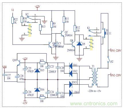 (1)當(dāng)開關(guān)S2斷開時(shí),整充電器處于智能充電過程。充電器啟動(dòng)時(shí),繼電器K1閉合,同時(shí)K2為斷開狀態(tài)。當(dāng)有感應(yīng)負(fù)載時(shí),七彩燈閃爍,Ui為高電平,此時(shí)Q5飽和,電壓Uceq為0.67V,低于Q2+Q4的導(dǎo)通電壓之和(1.34V),Q2與Q4構(gòu)成達(dá)林頓,同時(shí)截止,繼器K1吸合;當(dāng)感應(yīng)負(fù)載充滿電(或無感應(yīng)負(fù)載)時(shí),綠燈亮,即Ui為低電平,此時(shí)Q3截止,電容C5與R9構(gòu)成RC充電電路,當(dāng)電容充電電壓到達(dá)Q2與Q4的導(dǎo)通電壓時(shí),Q2導(dǎo)通,使Q4飽和,此時(shí)繼電器工作電壓只有0.67V,繼電器斷開,整個(gè)電路處于完全斷電狀態(tài)。