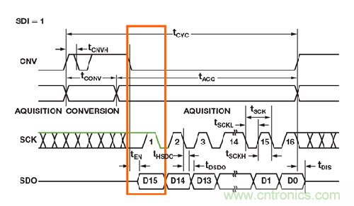 ADI 公司帶SPI 接口的許多SAR ADC 都是從 CS 或CNV 的下降沿為MSB 提供時(shí)鐘信號(hào),剩余的數(shù)據(jù)位則跟隨SCLK 的下降沿,如圖3 所示。在讀取MSB 數(shù)據(jù)時(shí),要使用等式中的tEN 而非tDRV。