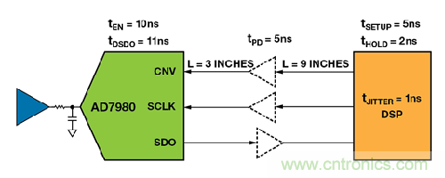 在圖4 中,DSP 主機(jī)訪(fǎng)問(wèn) AD7980 處于3 線(xiàn) CS 模式下,其中,VIO = 3.3 V。DSP 鎖存SCLK 下降沿上的SDO 信號(hào)。DSP 的額定最小建立時(shí)間為5 ns,最小保持時(shí)間為2 ns。對(duì)于典型的FR-4PCB 板,傳播延遲約為180 ps/in。緩沖器的傳播延遲為5 ns。CNV、SCLK 和SDO 的總傳播延遲為