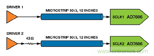 在圖7 中,一個(gè)驅(qū)動(dòng)器通過(guò)一條12 英寸的微帶線(xiàn)路連接SCLK1,另一個(gè)驅(qū)動(dòng)器通過(guò)一個(gè)與微帶串聯(lián)的43 Ω 電阻連接SCLK2。