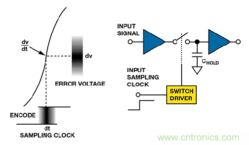 孔徑或采樣時(shí)鐘抖動(dòng)設(shè)定SNR 限值,尤其是對(duì)高頻輸入信號(hào)。系統(tǒng)抖動(dòng)有兩個(gè)來(lái)源:來(lái)自片內(nèi)采樣保持電路的孔徑抖動(dòng)(內(nèi)部抖動(dòng)),以及采樣時(shí)鐘上的抖動(dòng)(外部抖動(dòng))??讖蕉秳?dòng)為轉(zhuǎn)換間的 采樣時(shí)間變化,為ADC 的函數(shù)。采樣時(shí)鐘抖動(dòng)通常為主要誤差源,但兩個(gè)源都會(huì)導(dǎo)致模擬輸入采樣時(shí)間變化,如圖9所示。它們的影響難以區(qū)分。