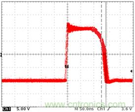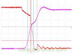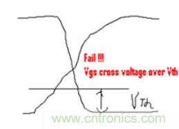 下面這種情況有非常多的人會(huì)忽視,甚至是一些比較有經(jīng)驗(yàn)的電源測(cè)試工程師。下面組圖四是下管打開(kāi),上管關(guān)閉時(shí)候的波形(圖4-1是示意圖,圖4-2示實(shí)際測(cè)試圖)。雖然沒(méi)有被同時(shí)帶起的情況,但是請(qǐng)注意上下管有交叉的現(xiàn)象,而且交叉點(diǎn)的電平遠(yuǎn)高于MOS管規(guī)定的Vth值,這是個(gè)嚴(yán)重的shoot through現(xiàn)象。最直接的后果就是MOS管燒毀!