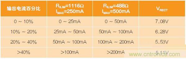 該器件系列具有動態(tài)整流器控制功能以改善負(fù)載瞬態(tài)特性(表2)。Qi標(biāo)準(zhǔn)有一個相對緩慢的全局反饋回路,最多可能需要100ms的時間來改變工作點。這意味著負(fù)載階躍會降低輸出電壓并引起系統(tǒng)復(fù)位。為了提供足夠的電壓應(yīng)對瞬態(tài)變化,在低負(fù)載時需要把VRECT工作點設(shè)高。該特性有助于負(fù)載階躍,但會降低輕載效率。為解決這個問題,用動態(tài)效率調(diào)節(jié)功能來調(diào)節(jié)輕載電壓,以適應(yīng)最大輸出負(fù)載。此外,還用一個電阻器來設(shè)定最大輸出電流。