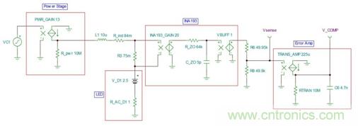 圖2是仿真控制回路的圖1的簡(jiǎn)單SPICE模型。VC1是COMP引腳上的電壓,直接驅(qū)動(dòng)跨導(dǎo)增益為13的功率級(jí)(控制器更多的內(nèi)部細(xì)節(jié)請(qǐng)參見(jiàn)TPS54218數(shù)據(jù)表內(nèi)的圖31)。這個(gè)電流通過(guò)電感器和感測(cè)電阻器來(lái)直接驅(qū)動(dòng)LED。需要注意的是,電感值和LED值的變化不會(huì)對(duì)響應(yīng)產(chǎn)生影響,這是因?yàn)殡姼衅髦械碾娏魇艿搅丝刂啤?/div>
