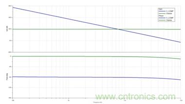 外部補(bǔ)償組件C6從這個(gè)點(diǎn) (V_COMP) 上接地。需要注意的是,V_COMP也是我們回路仿真的起始點(diǎn) (VC1)?;芈吩鲆媸荲_COMP引腳上測(cè)得的電壓除以VC1上的注入擾動(dòng)。所以,通過(guò)將VC1設(shè)定為1 Vac信號(hào),回路增益最終就是V_COMP上測(cè)得的電壓。