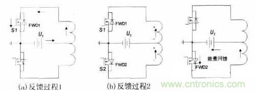 當(dāng)S1開通時(shí),其漏源電壓uDS1只是一個(gè)開關(guān)管的導(dǎo)通壓降,在理想情況下可假定uDS1=0,而此時(shí)由于在繞組中會(huì)產(chǎn)生一個(gè)感應(yīng)電壓,并且根據(jù)變壓器初級(jí)繞組的同名端關(guān)系,該感應(yīng)電壓也會(huì)疊加到關(guān)斷的S2上,從而使S2在關(guān)斷時(shí)承受的電壓是輸入電壓與感應(yīng)電壓之和約為2UI.在實(shí)際中,變壓器的漏感會(huì)產(chǎn)生很大的尖峰電壓加在S2兩端,從而引起大的關(guān)斷損耗,變換器的效率因受變壓器漏感的限制,不是很高。在S1和S2的漏極之間接上RC緩沖電路,也稱為吸收電路,用來抑制尖峰電壓的產(chǎn)生。并且為了給能量回饋提供反饋回路,在S1和S2兩端都反并聯(lián)上續(xù)流二極管FWD.