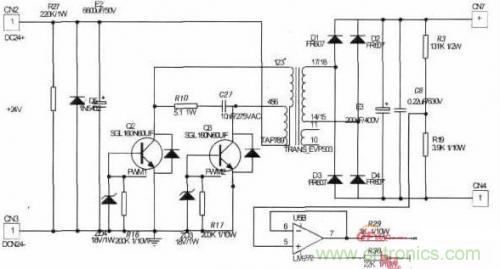 圖5為簡化后的主電路。輸入24V直流電壓,經(jīng)過大電容濾波后,接到推挽變壓器原邊的中間抽頭。變壓器原邊另外兩個(gè)抽頭分別接兩個(gè)全控型開關(guān)器件IGBT,并在此之間加入RC吸收電路,構(gòu)成推挽逆變電路。推挽變壓器輸出端經(jīng)全橋整流,大電容濾波得到220V直流電壓。并通過分壓支路得到反饋電壓信號(hào)UOUT.