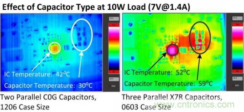 在使用C0G(較大封裝,低串聯(lián)等效電阻(ESR))和X7R(較小封裝,較高ESR)時的熱性能差異是十分可觀的(圖5)。
