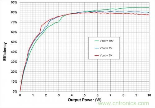 圖6.在5V,7V和10V輸出設(shè)置時,10W電源系統(tǒng)的端到端效率