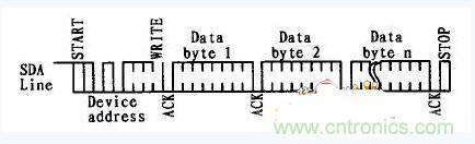 如果主設(shè)備要向EEPROM中寫(xiě)數(shù)據(jù),在地址字節(jié)中主設(shè)備向EEPROM發(fā)出一個(gè)寫(xiě)請(qǐng)求(R/W=0),發(fā)送的地址字節(jié)之后緊跟著要發(fā)送的數(shù)據(jù)。每發(fā)送一個(gè)字節(jié)的數(shù)據(jù)后EEPROM就會(huì)產(chǎn)生一個(gè)應(yīng)答信號(hào),主設(shè)備也會(huì)監(jiān)控應(yīng)答信號(hào),如果在發(fā)送一個(gè)字節(jié)后EEPROM沒(méi)有返回應(yīng)答信號(hào),則主設(shè)備就會(huì)停止發(fā)送,并生成一個(gè)結(jié)束信號(hào)。寫(xiě)操作的時(shí)序如圖3所示。