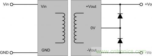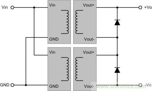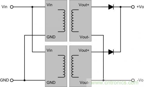如一個(gè)5V轉(zhuǎn)±12V的電源,若臨時(shí)需要5V轉(zhuǎn)24V,可把負(fù)當(dāng)?shù)?,正輸出?dāng)24V電源,輸出24VDC。應(yīng)用時(shí),在輸出各方向并聯(lián)一個(gè)二極管續(xù)流,防止兩路啟動(dòng)時(shí)間不同,由一路通過(guò)負(fù)載給另一路的內(nèi)部電路充電。