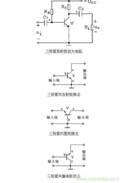 為了更進(jìn)一步的說明這種三極管開關(guān)電路的設(shè)計原理,在這里我們以NPN三極管的共發(fā)射極放大電路為例,來具體的說明一下。下圖中所提供的三種連接方式是三極管放大電路最常見的,除了共發(fā)射極聯(lián)接方式外,還有共集電極和共基極聯(lián)接方式。