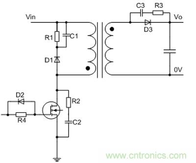 二極管在高速導通和關(guān)斷時,反向恢復期間,二極管的寄生電感和電容會產(chǎn)生高頻振蕩,為了抑制高頻振蕩可在二極管兩端加RC緩沖電路如圖2所示,電阻R3一般在1Ω~100Ω,電容C3一般在100pF~1nF,如果電源工作頻率較低,效率滿足要求的話,二極管D3可以選擇反向恢復時間較慢的二極管。