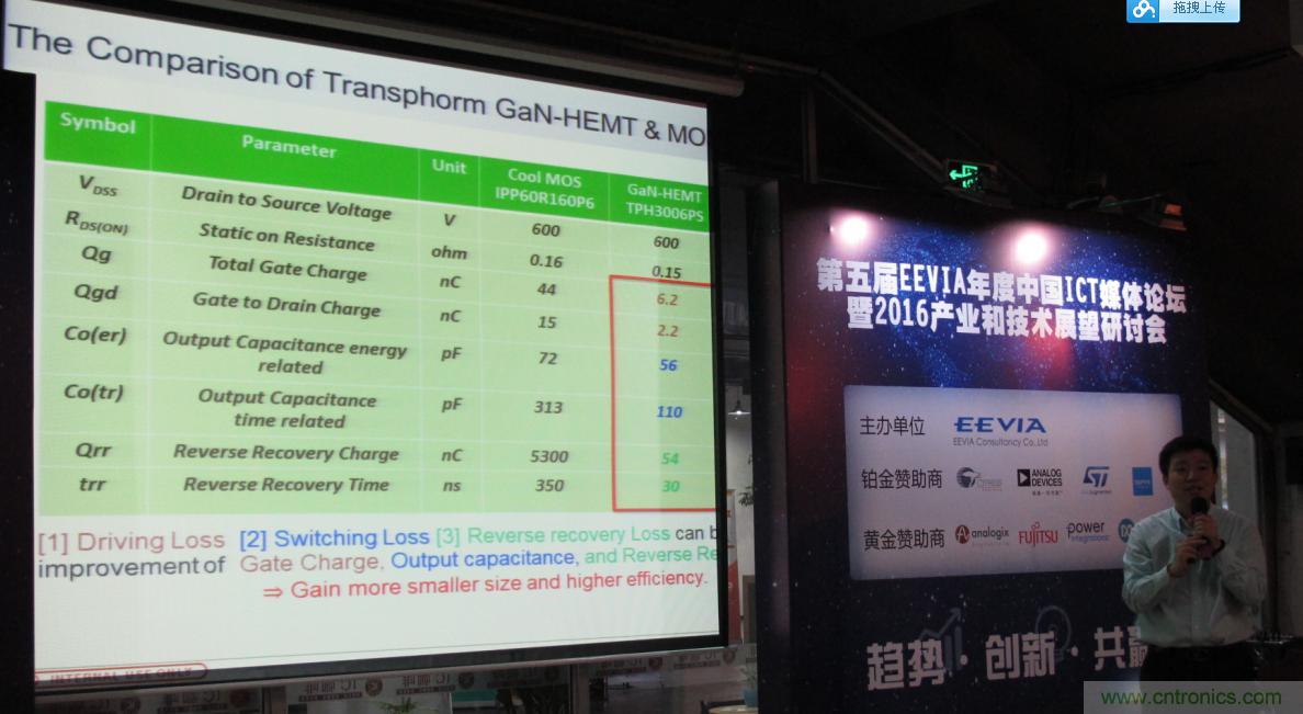 富士通電子元器件高級(jí)市場(chǎng)經(jīng)理蔡振宇(Eric)的“氮化鎵產(chǎn)品主要的應(yīng)用場(chǎng)景和未來(lái)的趨勢(shì)”主題分享,將富士通電子旗下代理產(chǎn)品線Transphorm公司獨(dú)特GaN技術(shù)和產(chǎn)品方案第一次帶到中國(guó)媒體面前,采用創(chuàng)新的Cascode結(jié)構(gòu)的HEMT高壓產(chǎn)品讓Transphorm在氮化鎵功率表技術(shù)領(lǐng)域劍走偏鋒,成為該陣營(yíng)的領(lǐng)頭羊。