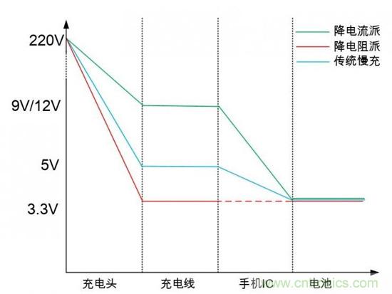 從電壓的角度來對比一下傳統(tǒng)慢充、降電阻快充技術(shù)與降電流快充技術(shù),如下圖所示。