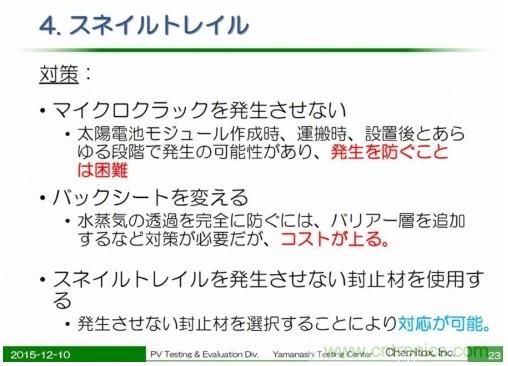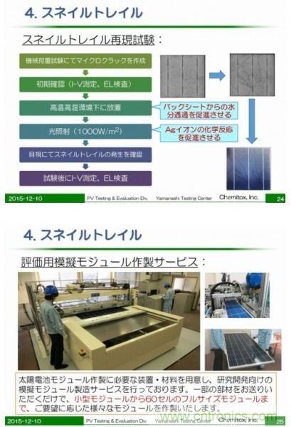 例如,試制新的封裝材料和背板時,除了要驗證的零部件以外,還要制作利用現(xiàn)有產(chǎn)品構(gòu)成的太陽能電池板,在電池板上再現(xiàn)蝸牛紋產(chǎn)生的條件。對材料廠商來說,無論是制作這種驗證用電池板,還是再現(xiàn)引發(fā)蝸牛紋的條件都比較困難。