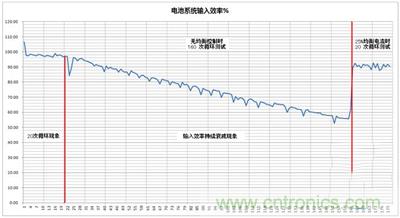 圖1中,關(guān)閉主動(dòng)均衡控制的160次循環(huán)測(cè)試中,前20次的輸入效率保持在95%以上,一個(gè)非常平穩(wěn)的輸入效率,這就是“首20次循環(huán)現(xiàn)象”;在20次以后的測(cè)試中,電池系統(tǒng)的輸入效率隨充放電次數(shù)下降(充電和放電條件不變),在第40次時(shí),約為90%,在第70次時(shí),約為80%,在100次時(shí),已經(jīng)降到70%,而在第160次時(shí),約為55%。