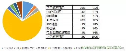 首先,我們考慮一下能量分配,在SOC從整個(gè)100%到零或者說(shuō)整個(gè)電池能量管理過(guò)程可以分解為:上下兩段留存的不可用能量(純電動(dòng)汽車(chē)上下留余更多一些)、可用能量、SOC誤差、調(diào)節(jié)電池溫度所需要的能量、容量下降的補(bǔ)償、插電式混合動(dòng)力汽車(chē)的CS緩沖區(qū)(純電動(dòng)沒(méi)有這段)。
