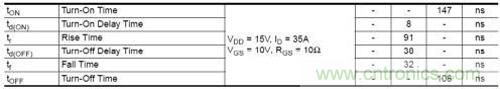 以FAIRCHILD公司的MOS為例,如表1所示:FDD8880開(kāi)關(guān)時(shí)間特性表。