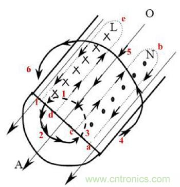 變壓器的鐵損主要由變壓器渦流損耗產(chǎn)生,如圖3所示,給線(xiàn)圈加載高頻電流時(shí),在導(dǎo)體內(nèi)和導(dǎo)體外產(chǎn)生了變化的磁場(chǎng)垂直于電流方向(圖中1→2→3和4→5→6)。根據(jù)電磁感應(yīng)定律,變化的磁場(chǎng)會(huì)在導(dǎo)體內(nèi)部產(chǎn)生感應(yīng)電動(dòng)勢(shì),此電動(dòng)勢(shì)在導(dǎo)體內(nèi)整個(gè)長(zhǎng)度方向(L面和N面)產(chǎn)生渦流(a→b→c→a和d→e→f→d),則主電流和渦流在導(dǎo)體表面加強(qiáng),電流趨于表面,那么,導(dǎo)線(xiàn)的有效交流截面積減少,導(dǎo)致導(dǎo)體交流電阻(渦流損耗系數(shù))增大,損耗加大。
