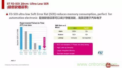 除了低功耗與低成本,F(xiàn)D-SOI工藝在可靠性上也表現(xiàn)出色。沈磊指出,從意法半導(dǎo)體給出的數(shù)據(jù)來看,由于FD-SOI工藝的敏感體積更小,對閂鎖效應(yīng)(latch-up)免疫,具備更低的SRAM軟錯(cuò)誤率,以及更好的電磁兼容性,使其更適用于高可靠應(yīng)用領(lǐng)域,例如汽車、銀行與生命維持系統(tǒng)等。