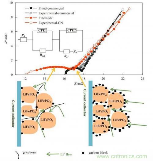 EIS分析顯示,添加石墨烯的實(shí)驗(yàn)組電池的歐姆阻抗要明顯低于對(duì)照組電池,這主要得益于石墨烯的片狀結(jié)構(gòu)能夠于活性物質(zhì)顆粒形成很好的接觸,降低接觸電阻,但是在高頻段的電荷交換阻抗,實(shí)驗(yàn)組電池要明顯高于對(duì)照組電池,這表明石墨烯的加入影響了Li+在電極內(nèi)的擴(kuò)散。仿真結(jié)果顯示,主要是由于石墨烯的片狀結(jié)構(gòu)對(duì)Li+的擴(kuò)散形成了阻礙,導(dǎo)致Li+的擴(kuò)撒路徑延長,從而造成了添加石墨烯的鋰離子電池在大電流下極化增加,導(dǎo)致電池的放電容量下降。而傳統(tǒng)的炭黑、導(dǎo)電碳纖維和導(dǎo)電石墨等材料,由于橫截面較小,因此對(duì)Li+的擴(kuò)散阻礙較小,對(duì)鋰離子電池大電流放電性能影響不大。