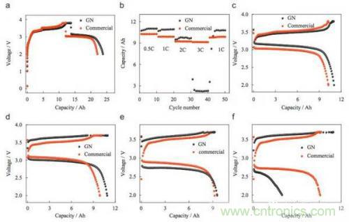 在隨后的倍率實(shí)驗(yàn)中發(fā)現(xiàn),在0.5C、1C和2C的充放電倍率下,實(shí)驗(yàn)組的石墨烯導(dǎo)電劑電池相比于對(duì)照組電池都表出了更高的容量和更小的極化,但是當(dāng)充放電倍率提高到3C時(shí),實(shí)驗(yàn)組電池容量迅速下降到4Ah以下,而對(duì)照組電池的容量仍然保持在9Ah左右,繼續(xù)將放電倍率提高到4C,實(shí)驗(yàn)組石墨烯導(dǎo)電劑電池由于極化太大,已經(jīng)無法放電,而對(duì)照組電池則相對(duì)穩(wěn)定。