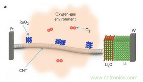 環(huán)境透射電子顯微鏡能夠在氧氣環(huán)境下進(jìn)行工作,從而使得在原子級別對鋰氧電池的反應(yīng)過程進(jìn)行直接的觀測成為可能。實(shí)驗(yàn)中Langli Luo利用載有納米RuO2催化劑的CNT作為正極,金屬Li作為負(fù)極,金屬Li表層的Li2O作為固體電解質(zhì),電池結(jié)構(gòu)如下圖所示。