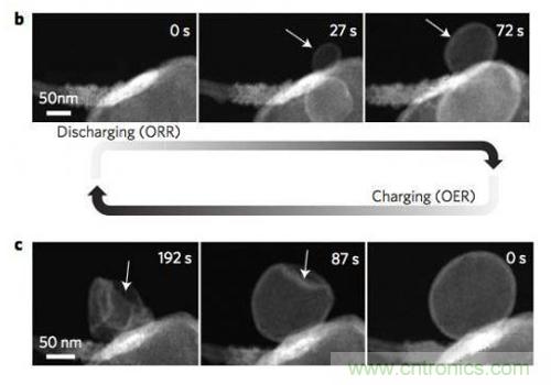 顯微鏡對全固態(tài)Li-O2電池的反應(yīng)機(jī)理進(jìn)行了研究,研究顯示在CNT表面首先形成LiO2化合物,隨后該產(chǎn)物發(fā)生歧化反應(yīng)生成Li2O2和O2,O2的釋放生成了一個(gè)外層由Li2O構(gòu)成,內(nèi)層由Li2O2構(gòu)成的中空球狀結(jié)構(gòu)。目前該型研究成果已經(jīng)發(fā)表在了最新的Natural Nanotechnology雜志上。
