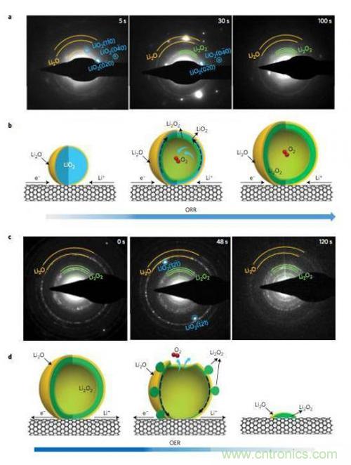 研究顯示,初始反應(yīng)產(chǎn)物L(fēng)iO2很快會發(fā)生歧化反應(yīng)生成Li2O2和O2,在顆粒內(nèi)部釋放的O2被封鎖在了顆粒的內(nèi)部,從而導(dǎo)致了顆粒成為中空結(jié)構(gòu),如下圖所示。從SAED的分析結(jié)果來看,在開始的幾秒鐘時(shí)間內(nèi),反應(yīng)產(chǎn)物中只有LiO2,30秒之后,Li2O2和LiO2開始共存,大約100s后LiO2的衍射峰消失,反應(yīng)產(chǎn)物只剩下Li2O2和Li2O,TEM分析結(jié)果顯示中空球的外側(cè)為Li2O,內(nèi)側(cè)為Li2O2。充電過程則正好相反,開始的時(shí)候觀察到了Li2O和Li2O2的衍射峰,在48s時(shí)出現(xiàn)了LiO2的衍射峰,但是在120s時(shí)并沒有再出現(xiàn)LiO2的衍射峰,說明LiO2只是Li2O2分解的一個(gè)中間產(chǎn)物。整個(gè)過程為我們揭示了Li-O2電池的充放電反應(yīng)途徑,在放電的時(shí)候,Li+通過電解液擴(kuò)散到CNT表面,在三相界面發(fā)生反應(yīng),生成LiO2,然后LiO2發(fā)生歧化反應(yīng)(LiO2?Li2O2+O2),生成Li2O2和O2,反應(yīng)釋放的O2會將反應(yīng)產(chǎn)物從最初的10nm左右,吹到100nm左右,而在產(chǎn)物的表面由于有豐富的Li+,因此會與O2反應(yīng)生成Li2O。在充電的過程中,Li2O2首先會失去一個(gè)Li+和一個(gè)電子,形成LiO2,隨后LiO2發(fā)生分解,產(chǎn)生Li2O2和O2,然后Li2O2再次失去Li+和電子,如此循環(huán)指導(dǎo)所有的Li2O2消耗完畢。