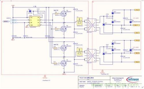 前級電源屬于典型定壓設(shè)計,無需給出設(shè)計原理,本文重點介紹后級半橋電路。具體原理圖見圖2和圖3。圖2為采用汽車級定時器電路設(shè)計的50%占空比信號發(fā)生器,用于給半橋開關(guān)電源提供控制信號,其中R49可以用來調(diào)整開關(guān)頻率,一般可以設(shè)定在70kHz到300kHz之間,頻率選擇主要根據(jù)電路板實際空間尺寸和變壓器的伏秒積進(jìn)行折衷選取。