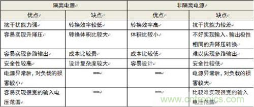 表1.隔離電源與非隔離電源優(yōu)缺點(diǎn)