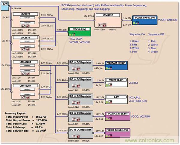 圖 3:用于 Arria 10 GX FPGA 電路板 (圖 1) 的電源樹。用 LTpowerPlanner 設(shè)計,該軟件是一款分析性和簡便易用的初步設(shè)計工具以用來映射電源要求。