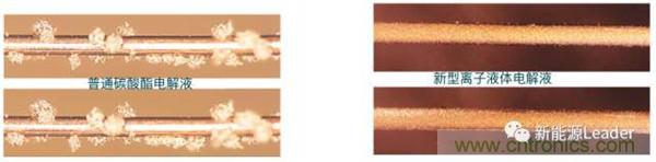 日本三重大學的Hui Wang等「3」開發(fā)了低濃度離子液體電解液,主要由溶解四甘醇二甲醚(G4或者G10H22O5),鋰鹽LiFSI,添加劑1,3-二氧戊環(huán)(DOL)組成,該電解液能夠有效的抑制鋰枝晶產生,在負極表面產生光滑的Li鍍層,提高金屬鋰負極的庫倫效率。鍍鋰后效果如下圖所示,從圖上可以看到采用新型電解液的銅電極表面鋰鍍層均勻分布(右圖),而采用傳統(tǒng)的碳酸酯類電解液的銅電極表面出現(xiàn)了大量的鋰枝晶(左圖)。