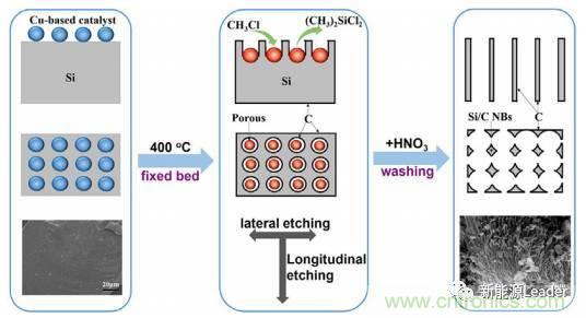 將Si材料與石墨復合也是克服Si體積膨脹的重要途徑,也是目前唯一上也化運用的方法。來自中科院過程所的Wenfeng Ren等[5]提出了一中新型的Si-C樹枝狀復合結構,如下圖所示。該方法首先在工業(yè)級多晶硅的表面分散一層銅基催化劑,然后在CH3Cl氣氛下,利用該催化劑對Si基體進行腐蝕,最終獲得樹枝狀的Si材料,這些Si晶體之間的空隙能夠很好的吸收體積膨脹,同時CH3Cl分解后會在Si表面形成一層無定形碳對Si形成保護,該材料在50mA/g的電流密度下,比容量可以達到849mAh/g,并具有良好的循環(huán)性能。