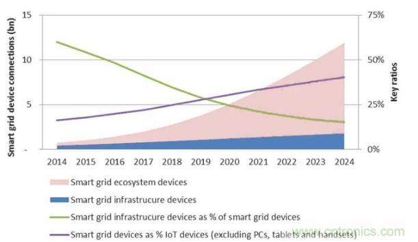 這些數(shù)字有三個(gè)明確的信息。首先,物聯(lián)網(wǎng)智能電網(wǎng)中包括的設(shè)備總量預(yù)計(jì)將迅速增長,從今天的不到10億而2024年增加將達(dá)到120億。第二,也許不奇怪的是,在依賴于智能電網(wǎng)功能的設(shè)備之前,將采用與智能電網(wǎng)基礎(chǔ)設(shè)施相關(guān)的設(shè)備。第三,與智能電網(wǎng)相關(guān)的設(shè)備將占據(jù)連接設(shè)備的越來越多的份額。這些預(yù)測顯示,到2024年,預(yù)計(jì)所有物聯(lián)網(wǎng)設(shè)備云連接(不包括PC,平板電腦和手機(jī))的40%以上屬于智能電網(wǎng)生態(tài)系統(tǒng),將智能電網(wǎng)和VPP概念牢固地置于物聯(lián)網(wǎng)(IoT)的核心之中。