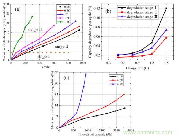 鋰離子電池的放電制度很大程度上依賴于使用者,好的放電制度對于有的使用者而言并不一定適用。但是充電制度則主要是設(shè)計者進(jìn)行控制,因此對于充電制度對電池壽命衰降的影響的研究,能夠更好的指導(dǎo)我們對鋰離子電池的設(shè)計。北京交通大學(xué)的YangGao等針對不同的充電制度對鋰離子電池壽命衰降的影響,并研究了其作用機理,提出了鋰離子電池的壽命衰降模型。YangGao的研究顯示,當(dāng)充電電流和截止電壓超過一定的數(shù)值時,鋰離子電池的衰降將被極大的加速,為了降低鋰離子電池的衰降速率,需要針對不同的體系,選擇合適的充放電電流和截止電壓。