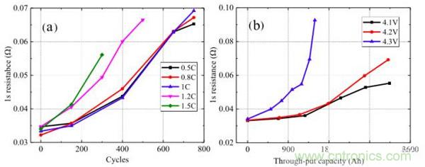對電池的動態(tài)內(nèi)阻分析如下圖所示,從圖a測試結(jié)果來看,當(dāng)充電電流小于1C時,電池動態(tài)內(nèi)阻隨著電池循環(huán)的變化趨勢幾乎時一樣的,但是當(dāng)充電電流超過1C時,電池動態(tài)內(nèi)阻增加速度會隨著充電速率的增加而快速增加。從圖b的測試結(jié)果來看,當(dāng)充電截止電壓為4.3V時,電池動態(tài)內(nèi)阻增加非常迅速表明高截止電壓會惡化電池的動力學(xué)條件,截止電壓為4.1V和4.2V時電池動態(tài)內(nèi)阻增加較為緩慢。
