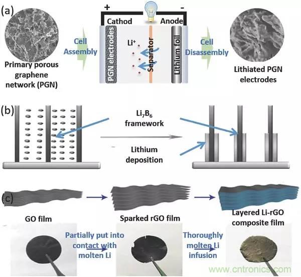 由于不存在鋰源,上述三種類型的CCs(即納米結構銅、碳涂覆銅、自支撐碳框架)不能直接用于LMBs中。在LMBs中需要額外的將鋰電沉積到這些CCs中并進行后續(xù)的電池拆卸過程。除了復雜性之外,這種組裝/拆卸過程可能引入雜質,引起副反應,并破壞負極的完整性。所以研究者又制造了含鋰合金,如Li-Mg、Li-B、Li-Sn等,并且在LMBs中使用時無枝晶形態(tài)。然而,高品質鋰合金難以制備,特別是具有特定納米結構的鋰合金。最近開發(fā)了熔融鋰浸液作為負載鋰的新技術。這種方法將傳統(tǒng)的加載過程從內部轉移到外部,在可控性、加載質量和CCs的選擇上更有優(yōu)勢。
