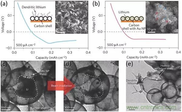 a-b)在0.5mA cm-2下,鋰離子沉積在沒有Au NPs和有Au NPs的空心碳殼上的電壓分布圖,插圖表示沉積后的SEM圖像以及相應的原理圖;