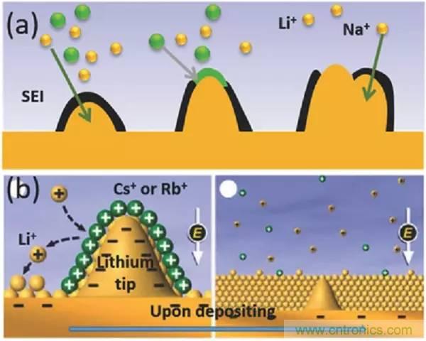 a)共沉積機制,Na+可以通過沉積在電化學活性鋰表面上來阻止枝晶生長;