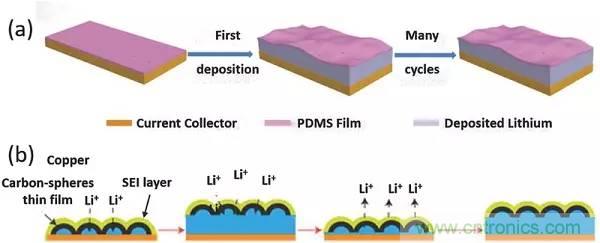 a)在涂覆多孔PDMS薄膜的Cu基底上沉積鋰;