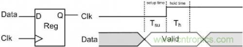 建立時間(Setup Time)常用Tsu表示,指的是在觸發(fā)器的時鐘信號上升沿到來以前,數(shù)據(jù)和使能信號穩(wěn)定不變的時間,如果建立時間不夠,數(shù)據(jù)將不能在這個時鐘上升沿被打入觸發(fā)器,使能信號無效,也就是說在這個時鐘周期對數(shù)據(jù)的操作時無效的;保持時間(Hold Time)常用Th表示,指的是在觸發(fā)器的時鐘信號上升沿到來以后,數(shù)據(jù)和使能信號穩(wěn)定不變的時間,如果保持時間不夠,數(shù)據(jù)同樣不能被打入觸發(fā)器,對數(shù)據(jù)的操作同樣是無效的,使能信號無效。數(shù)據(jù)要能穩(wěn)定傳輸,就必須滿足建立時間和保持時間的關(guān)系,圖 4標識了它們間的關(guān)系。