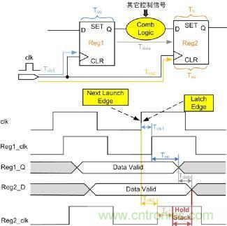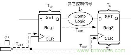 如圖 6所示,為分析建立時間/保持時間的基本電路圖。Tclk1為Reg1的時鐘延時,Tclk2為Reg2的時鐘延時,Tco為Reg1固有延時,Tdata為Reg1的到Reg2之間組合邏輯的延時,Tsu為Reg2的建立時間,Th為Reg2的保持時間,設(shè)時鐘clk周期為T,這里分析數(shù)據(jù)的建立時間和保持時間。