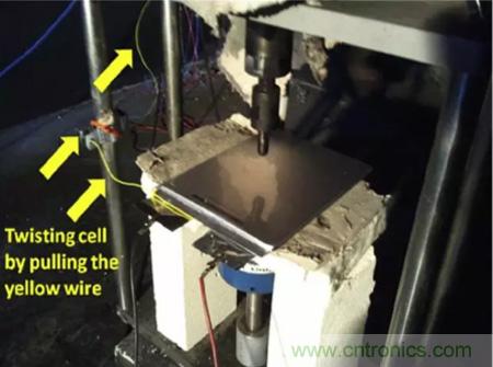 目前能夠模擬鋰離子電池內(nèi)短路的方式有多種,例如針刺測試,小壓痕測試,BAJ測試和機械擠壓測試等,通過對大尺寸方形電池特點的分析,Hsin Wang認為機械擠壓測試最適合應用方形鋰離子電池的測試上。但是在傳統(tǒng)的擠壓的測試中由于電池受到的破壞太大,幾乎所有的電池都會發(fā)生熱失控,因此傳統(tǒng)的擠壓測試對不同種類電池安全性的“分辨率”就很低,只有通過和不通過兩種結(jié)果,只能對鋰離子電池的安全性進行定性分析??赡軆蓚€電池都沒有通過安全性測試,但是A電池的安全性卻要好于B電池,為了能夠準確的評估不同體系電池的安全性能,Hsin Wang對傳統(tǒng)的擠壓實驗進行了改進,通過在電池負極極耳上施加一個拉力,讓電池產(chǎn)生大約5°的扭曲,從而減少在擠壓過程中電池受到的破壞,因此該實驗能夠準確的評估不同種類電池的的安全性高低。