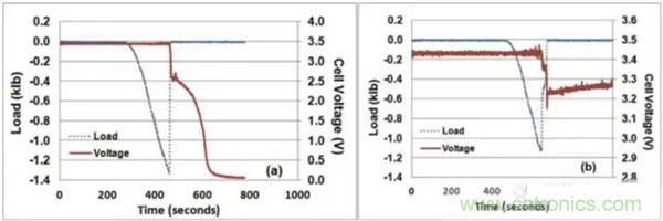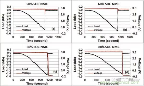 在對25Ah的NMC電池擠壓-扭轉(zhuǎn)測試中,發(fā)現(xiàn)50%SoC狀態(tài)下的電池都成功通過了測試,如圖a所示,60%SoC狀態(tài)下的電池有三只通過了測試,如圖b所示,另外的三只沒有通過測試,如圖c所示,可見60%SoC的電池通過測試和不通過測試的概率各為50%,而80%SoC的電池則都沒有通過測試,如圖d所示。由此可見,60%SoC是NMC電池安全性的一個分水嶺,低于這個數(shù)值時電池相對是安全的,高于這個數(shù)值,則電池在機械濫用的情況下的安全性將大大下降。