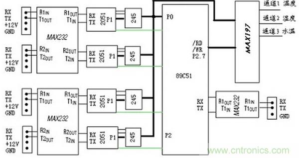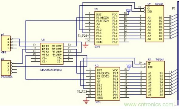 經(jīng)過(guò)分析,我們分別使用一塊2051單片機(jī)接收各路串口傳感器的數(shù)據(jù),同時(shí)使用一塊多路高精度ADC對(duì)轉(zhuǎn)換成電壓的溫度等信號(hào)采樣,系統(tǒng)結(jié)構(gòu)圖如圖1所示。主從機(jī)之間的具體管腳連接參見(jiàn)圖2。