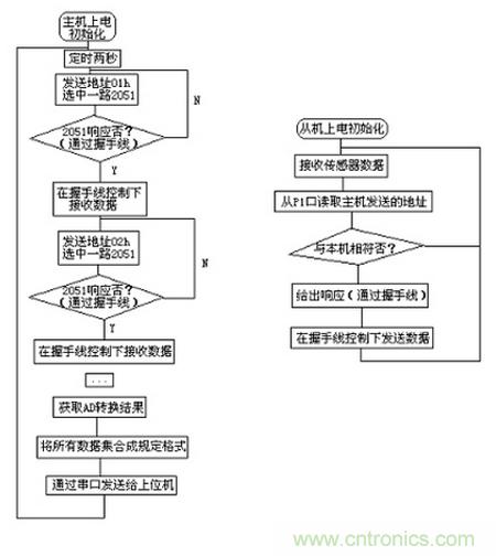 系統(tǒng)中51單片機(jī)作為主機(jī)控制著整個(gè)系統(tǒng)的動(dòng)作并發(fā)起每次通信,每塊2051作為實(shí)時(shí)從傳感器獲取數(shù)據(jù)并在主機(jī)控制下完成通信。主機(jī)和各從機(jī)之間通過(guò)并口連接通信。主從機(jī)工作流程如下: