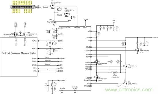 NCP81239支持寬輸入電壓范圍,提供從150 kHz至1.2 MHz動態(tài)可編程的開關(guān)頻率,集成4個MOSFET驅(qū)動,采用雙沿電流模式控制,支持輸出預偏置啟動,自適應(yīng)死區(qū)時間控制防止直通,具有獨立的輸入和輸出電流檢測,輸出電壓(范圍0至20V)可以通過I2C 編程,集成過壓、欠壓、過流和精確的過載保護等完善的保護功能,同時還提供對5 V Vconn電源的保護。